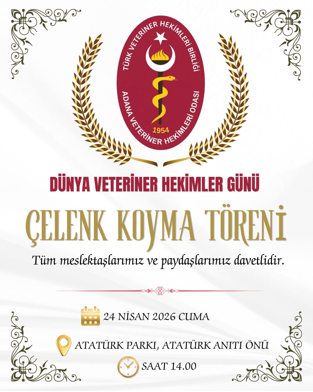 Dünya Veteriner Hekimler Günü etkinlikleri kapsamında düzenlenecek olan “Çelenk Sunma Törenine” tüm meslektaşlarımız ve paydaşlarımız davetlidir.